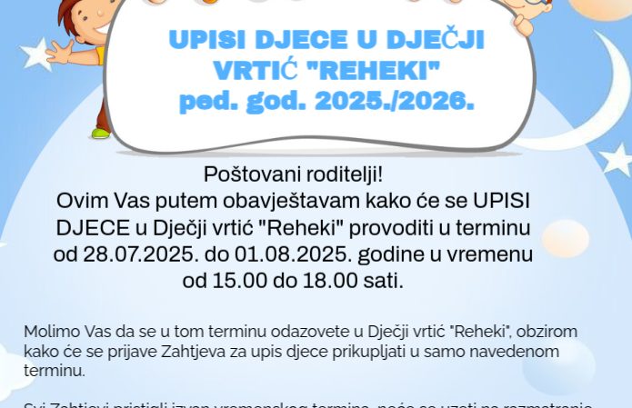 OBAVIJEST - Upisi djece u Dječji vrtić "Reheki" Poštovani roditelji! Ovim Vas putem obavještavam kako će se UPISI DJECE u Dječji vrtić "Reheki" provoditi u vremenu od 28.07.2025. do 01.08.2025. godine u vremenu od 15.00 do 18.00 sati. Molimo Vas da