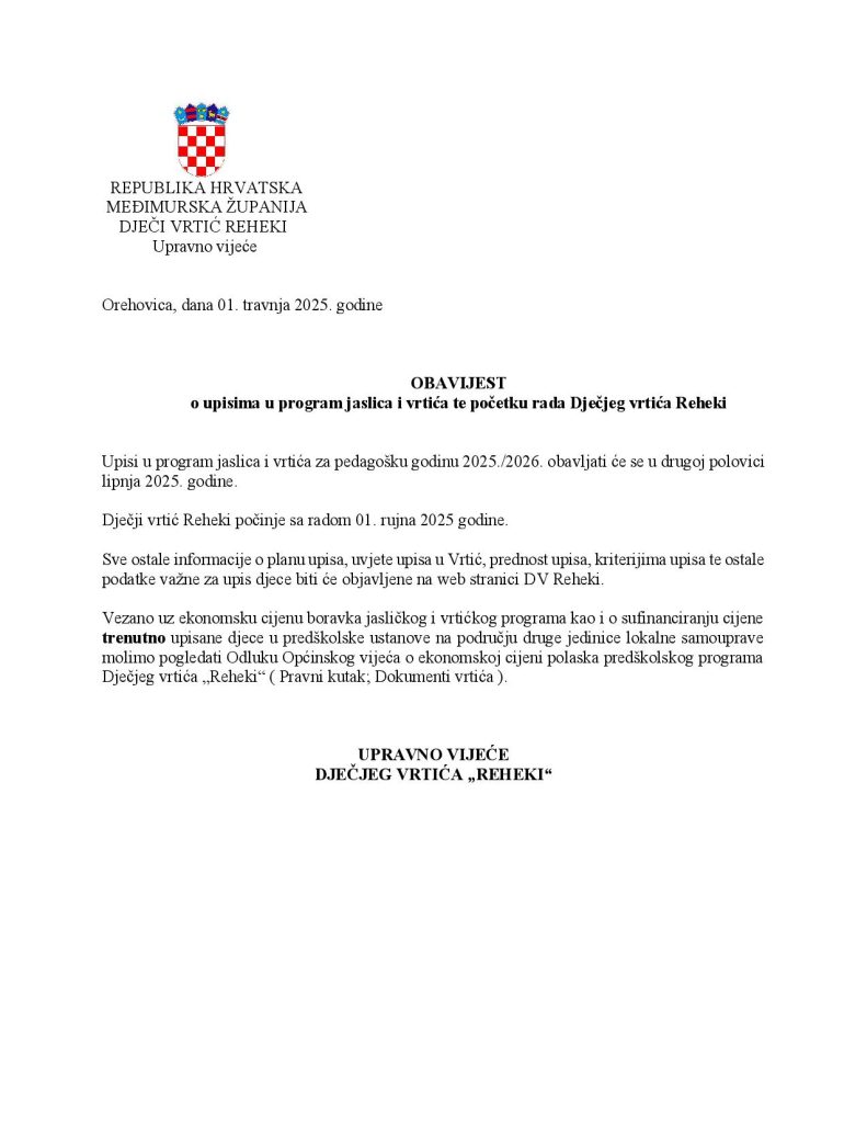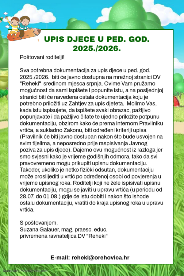 Ovim Vas putem obavještavam kako će se UPISI DJECE u Dječji vrtić “Reheki” provoditi u vremenu od 28.07.2025. do 01.08.2025. godine u vremenu od 15.00 do 18.00 sati.