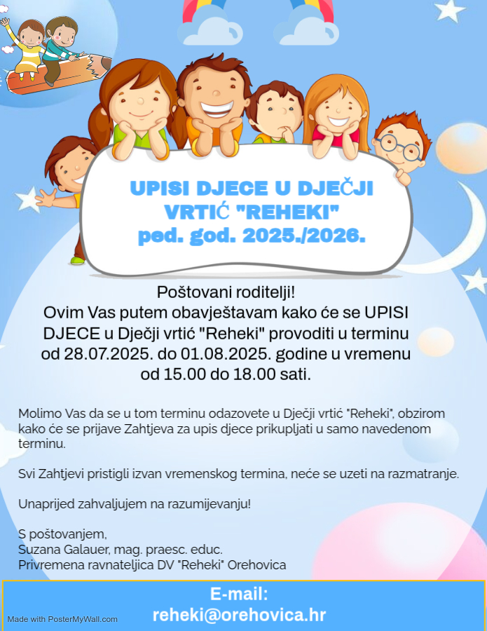 Ovim Vas putem obavještavam kako će se UPISI DJECE u Dječji vrtić “Reheki” provoditi u vremenu od 28.07.2025. do 01.08.2025. godine u vremenu od 15.00 do 18.00 sati.